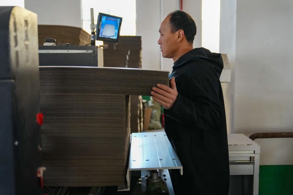 春節(jié)前后,位于大瑤鎮(zhèn)的瀏陽市凱洋包裝廠里,印刷、裁剪、折疊、黏合……自動化生產(chǎn)線每天下線5萬多個紙箱。