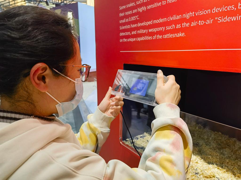 游客在上海自然博物館里通過(guò)紅外互動(dòng)裝置了解蛇如何“鎖定”獵物。新華社記者 陳愛(ài)平 攝