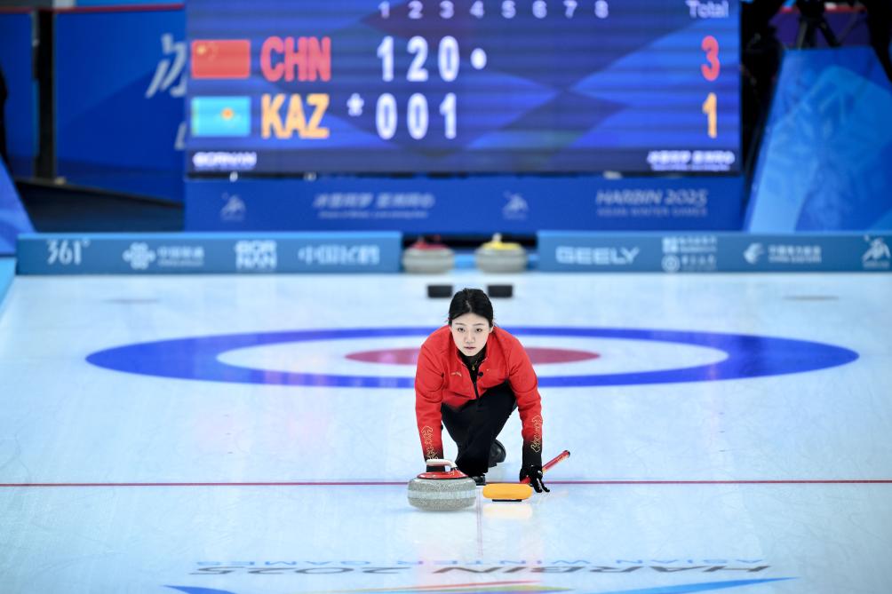 2月4日,中國隊(duì)選手韓雨在比賽中擲壺。新華社記者 江漢 攝
