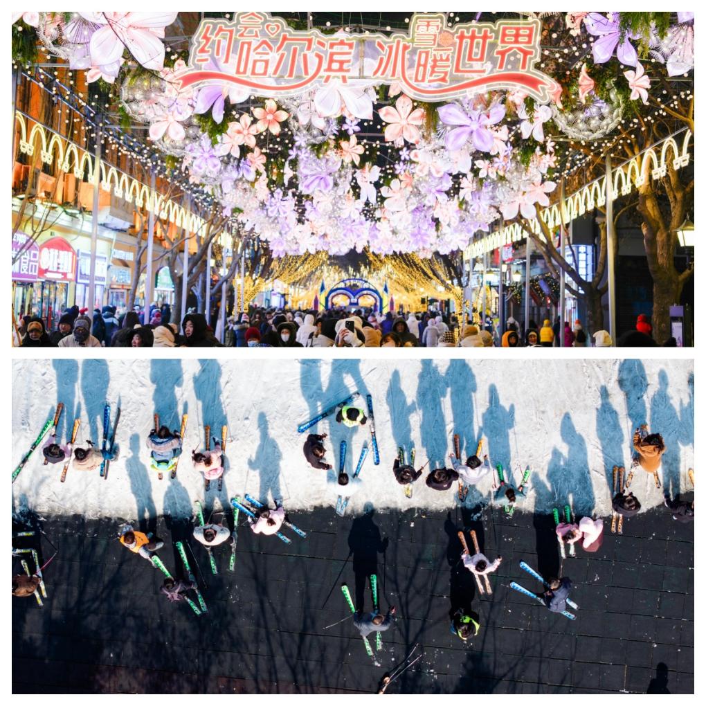 拼圖:(上圖)1月30日,游客在哈爾濱中央大街上游玩、拍照。(下圖)2月3日,游客在江蘇省淮安市馬頭鎮(zhèn)的古運河滑雪場滑雪(無人機照片)。