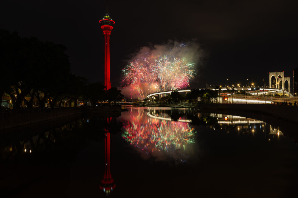 2月4日,澳門特區(qū)政府旅游局舉行的“歡樂春節(jié)靈蛇獻瑞煙花匯演”第二場在旅游塔對出海面絢麗綻放。新華社發(fā)(張金加攝)