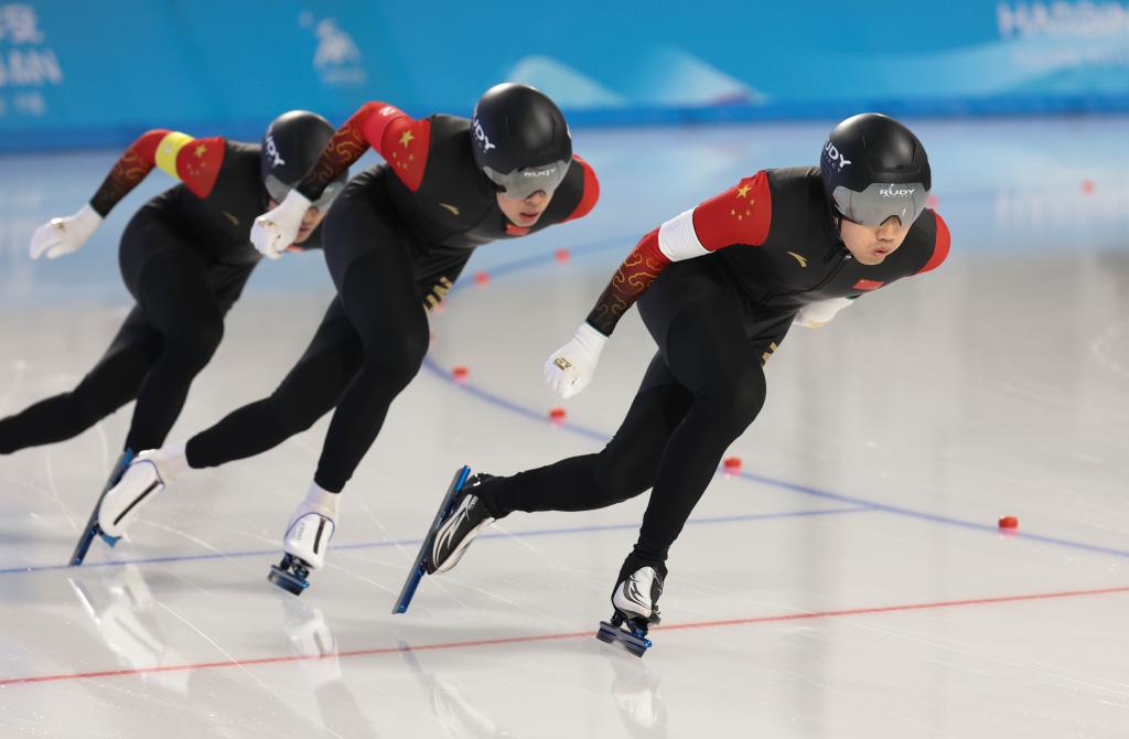 2月10日,中國隊選手高亭宇(右)、寧忠?guī)r、廉子文(中)在比賽中。當(dāng)日,第九屆亞冬會速度滑冰男子短距離團(tuán)體追逐賽在哈爾濱舉行。中國隊獲得冠軍。新華社記者 呂帥 攝