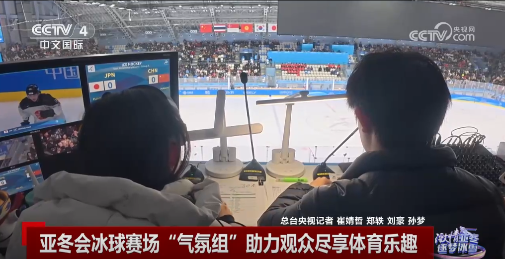 央視網(wǎng)消息:冰球比賽對抗激烈,運(yùn)動節(jié)奏快、場面精彩。第九屆亞冬會冰球項目賽場之一的哈爾濱冰球館,有這樣一個體育展示團(tuán)隊,他們被稱為“氣氛組”,通過音樂、燈光、大屏幕、觀眾互動等多手段,讓觀眾一起享受比賽。