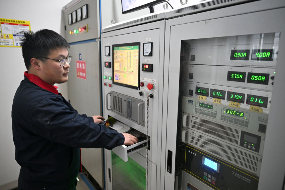 1月8日,在河南省科學院(沁陽)科創(chuàng)園,焦作同輻科技有限責任公司工作人員查看電子加速器系統(tǒng)運行狀態(tài)。