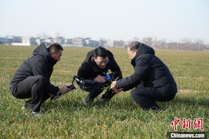 2月16日,茹振鋼在麥田里察看苗情。 中新社記者 闞力 攝