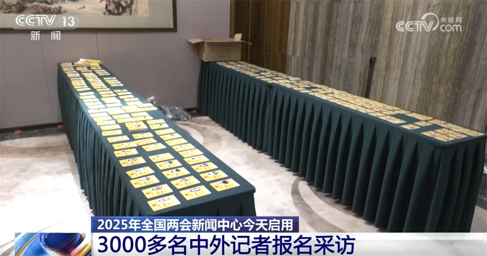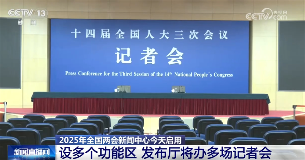與往年相同,今年全國兩會新聞中心設置了多個功能區(qū),其中,新聞發(fā)布廳和采訪室等已經(jīng)布置完畢。
