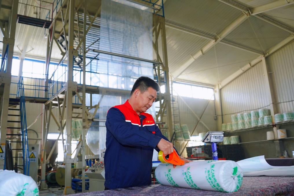 春耕備耕離不開充足的農(nóng)資供應。在新疆昌吉回族自治州吉木薩爾縣三臺鎮(zhèn)天露節(jié)水材料有限公司的生產(chǎn)車間,制膜機器高速運轉(zhuǎn),一卷卷嶄新的地膜源源不斷地“吐”出,工人們熟練地進行切割、封裝、碼放等作業(yè)。