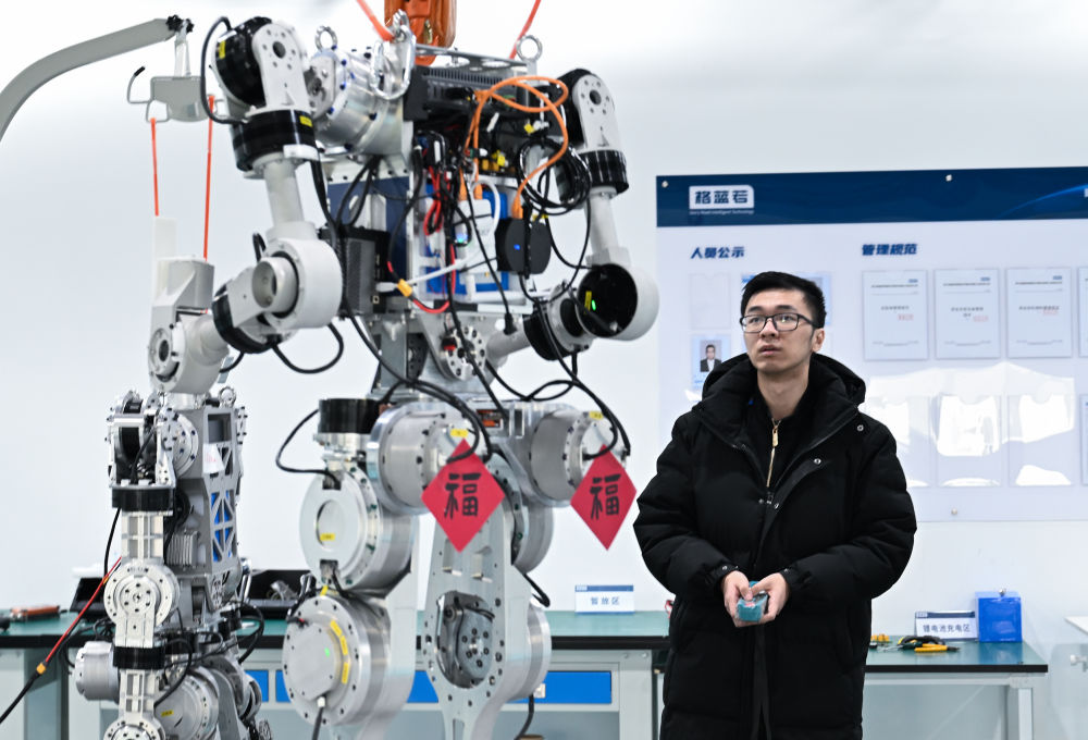 2月24日,湖北武漢格藍若智能技術(shù)股份有限公司員工在調(diào)試人形機器人。新華社記者杜子璇 攝