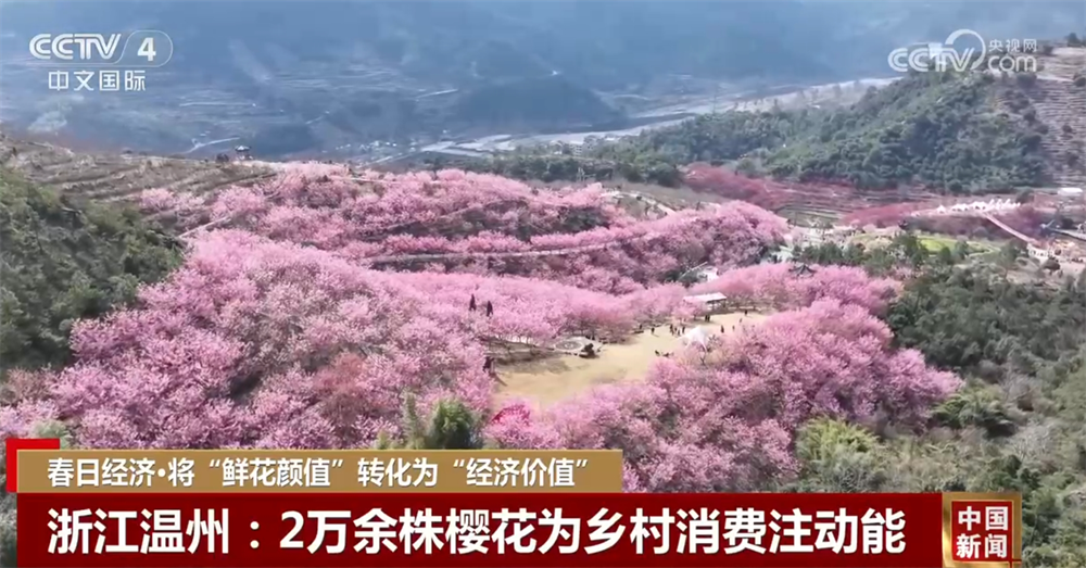 浙江省永嘉縣的溫州櫻花園占地3600畝,已開發(fā)利用1700多畝,種植了2萬余株櫻花,品種涵蓋臺(tái)灣牡丹櫻、紅粉佳人櫻等數(shù)十個(gè)品種。盛開的櫻花吸引了游客,也帶動(dòng)了當(dāng)?shù)夭惋?、住宿、旅游、交通等服?wù)消費(fèi)快速增長(zhǎng),自2月13日開園以來,櫻花園日均接待游客近3000人次,周末更是突破1萬多人。