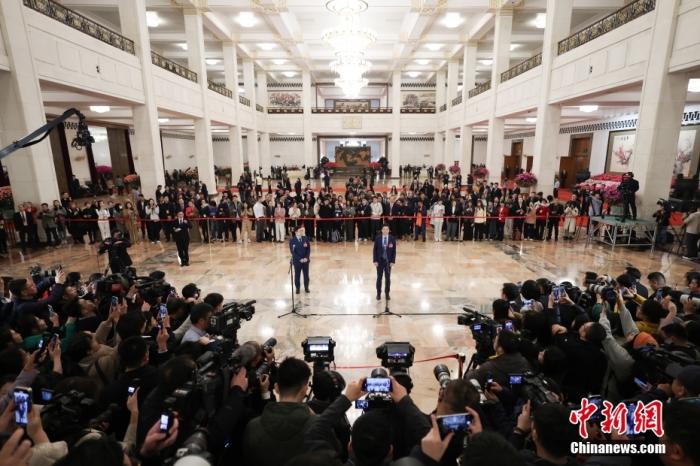 3月5日,十四屆全國人大三次會(huì)議首場(chǎng)“代表通道”集中采訪活動(dòng)在北京人民大會(huì)堂舉行。全國人大代表、小米集團(tuán)創(chuàng)始人、董事長(zhǎng)兼首席執(zhí)行官雷軍(右)、全國人大代表、海爾集團(tuán)董事局主席、首席執(zhí)行官周云杰接受采訪。中新社記者 富田 攝