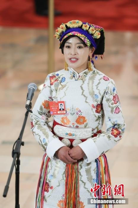 全國人大代表、四川省馬爾康市養(yǎng)護(hù)院院長(zhǎng)格西王姆接受采訪。中新社記者 富田 攝