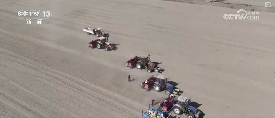 在酒泉金塔縣東壩鎮(zhèn)小河口村的這片麥田,多臺小麥播種機(jī)在田間作業(yè)。針對當(dāng)?shù)馗珊等庇甑臍夂蛱攸c(diǎn),2025年,當(dāng)?shù)夭捎脺\埋滴灌水肥一體化技術(shù),實(shí)現(xiàn)機(jī)械化播種。