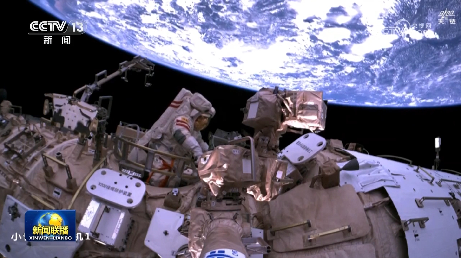 大約2個(gè)小時(shí)后,航天員宋令東也順利出艙,攀爬轉(zhuǎn)移至節(jié)點(diǎn)艙環(huán)形扶手處。隨著機(jī)械臂運(yùn)動(dòng)至艙外操作臺(tái)傳遞點(diǎn),宋令東配合蔡旭哲傳遞、安裝問天艙和氣閘艙的防護(hù)裝置,并安裝節(jié)點(diǎn)艙固定裝置底座。航天員王浩澤在天和核心艙內(nèi)密切協(xié)同。