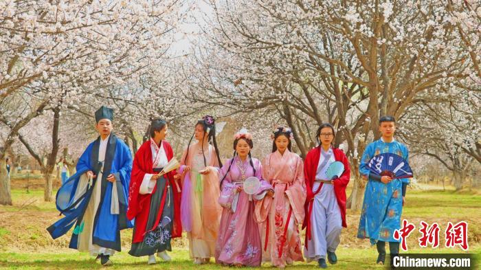 庫車杏花綻放,游人身著古裝漫步杏園。(資料圖)庫車市融媒體中心供圖