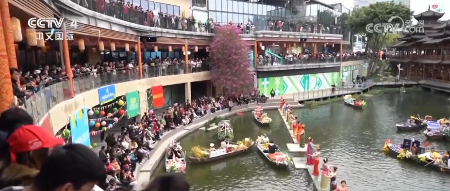 南寧民歌湖的民歌廣場是2025年廣西“三月三”的主會場。在水上主舞臺表演的是來自全國各地“四季村歌”歌隊的十幾個代表隊。2025年的廣西“三月三”主會場還有很多有意思的設(shè)置。比如,“有得花”鮮花市集、“有得?!笨萍汲蓖媸屑ⅰ坝械贸浴睎|南亞風情水上市集等。