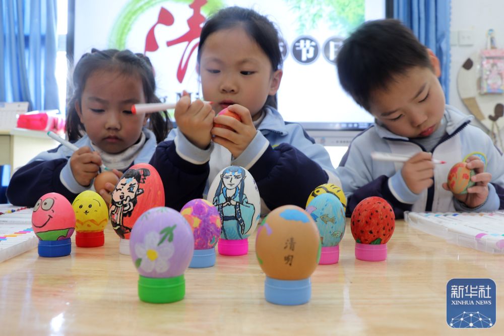 ↑ 4月3日,在浙江省金華市婺城小學(xué),小學(xué)生在制作清明花草蛋。新華社發(fā)(時寬兵攝)