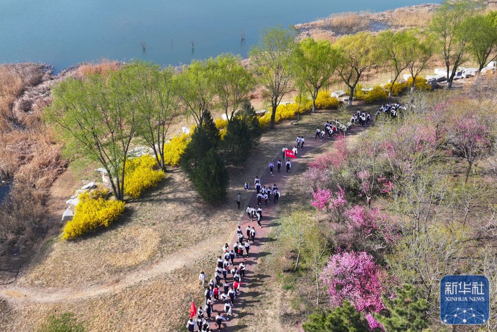 ↑ 4月3日,山東省高密市第五中學(xué)的中學(xué)生在膠河國家濕地公園參加踏青遠(yuǎn)足活動(無人機(jī)照片)。新華社發(fā)(李海濤攝)