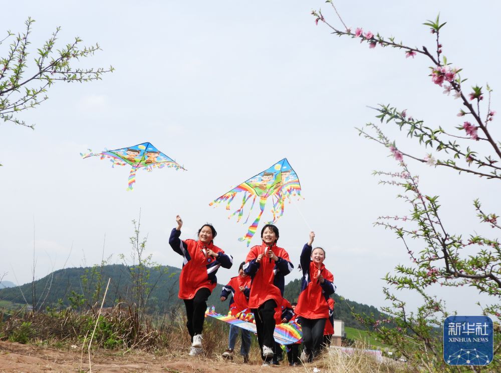 ↑ 4月3日,四川省達(dá)州市渠縣新市鎮(zhèn)第一小學(xué)學(xué)生在陽光大課間放風(fēng)箏。新華社發(fā)(鄧良奎攝)