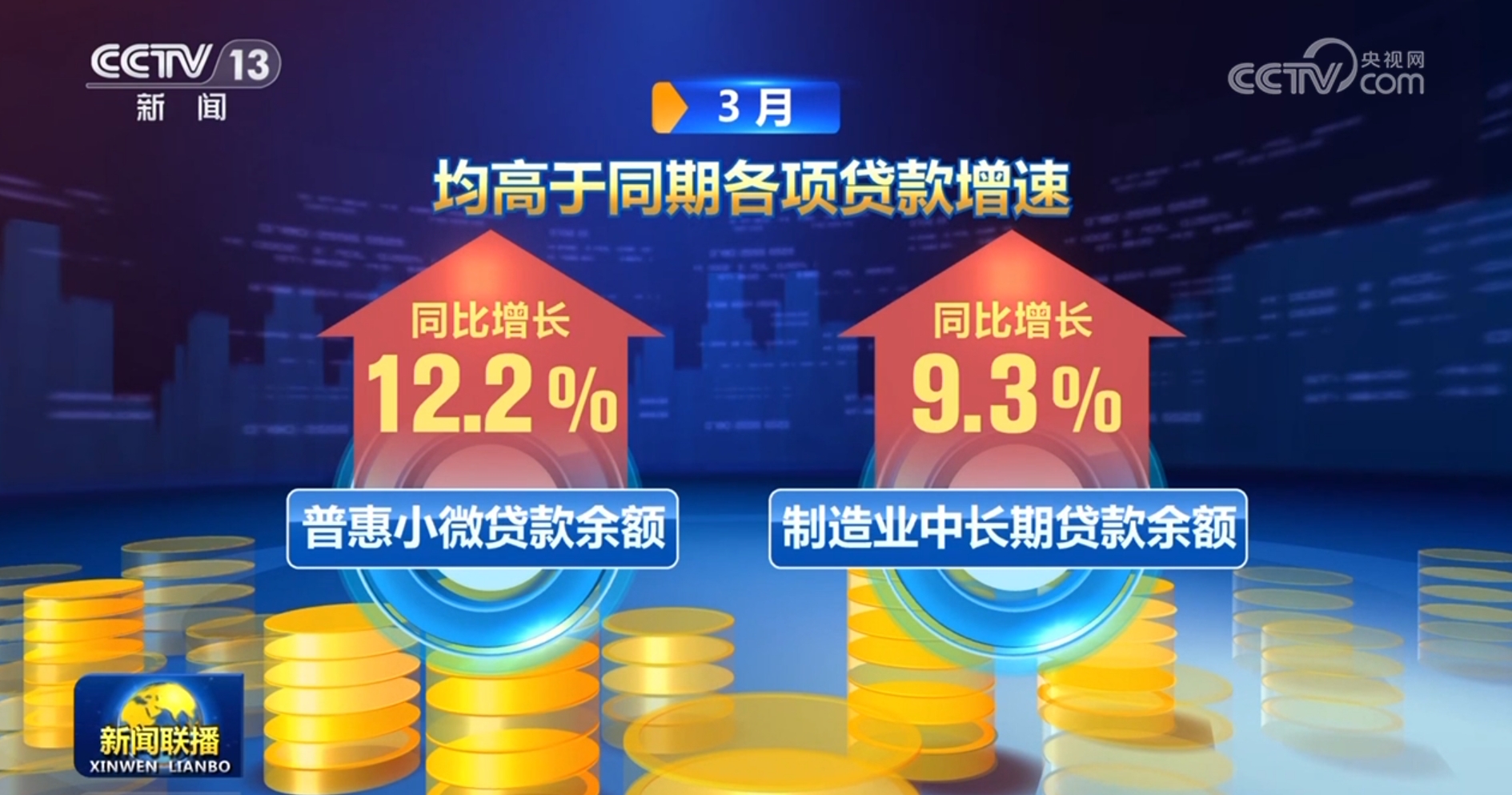 貸款同比多增,信貸結(jié)構(gòu)也出現(xiàn)不少亮點(diǎn)。3月,普惠小微貸款余額、制造業(yè)中長期貸款余額分別同比增長12.2%、9.3%,均高于同期各項(xiàng)貸款增速。