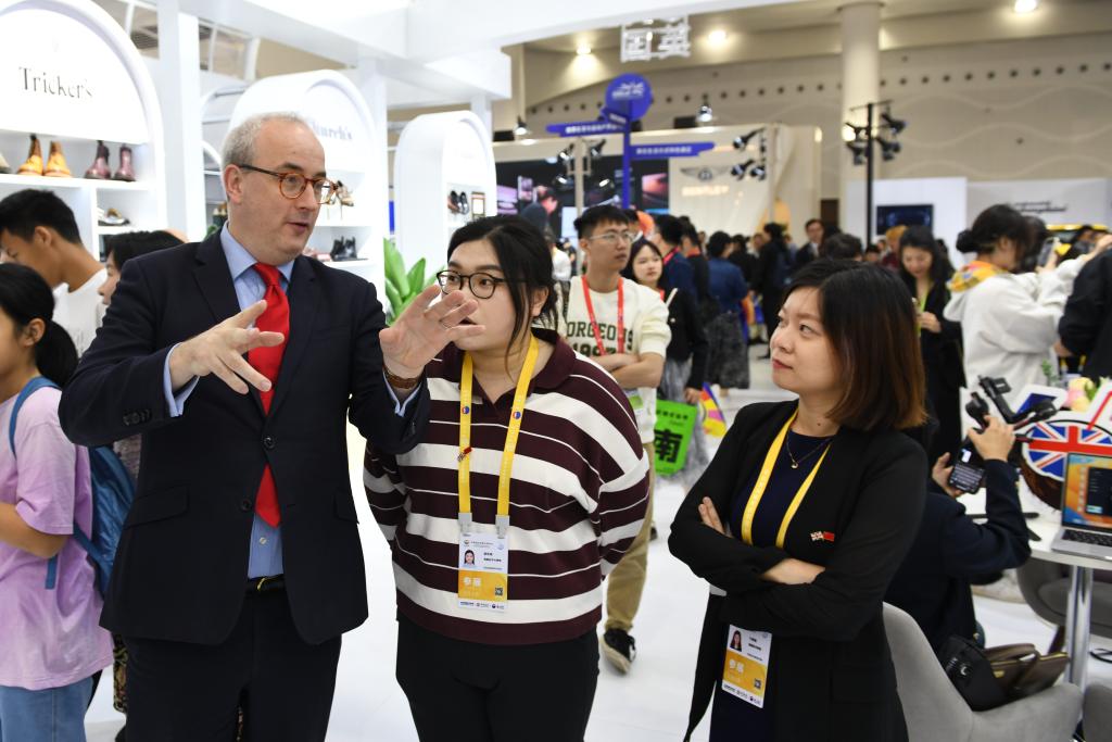 4月13日,外方人員在第五屆消博會(huì)英國(guó)國(guó)家館與中方工作人員交流。新華社記者 孫笑天 攝