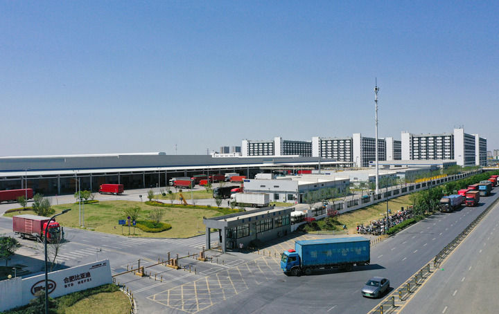 春風和煦,楊柳輕舞,從合肥市區(qū)驅(qū)車向北約35公里,行至長豐縣中南部的下塘鎮(zhèn),以比亞迪命名的主干道上,運送汽車零部件的貨車排成長長一列,魚貫而入比亞迪合肥基地園區(qū)。