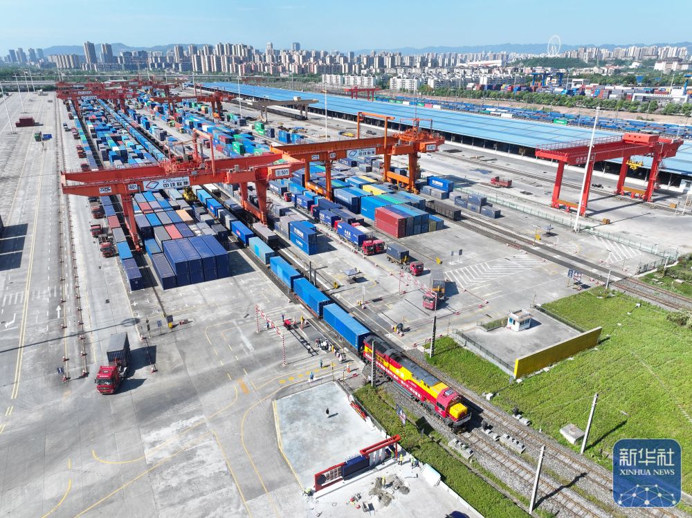 4月20日,圖定中亞班列在重慶團(tuán)結(jié)村中心站順利發(fā)車(無人機(jī)照片)。