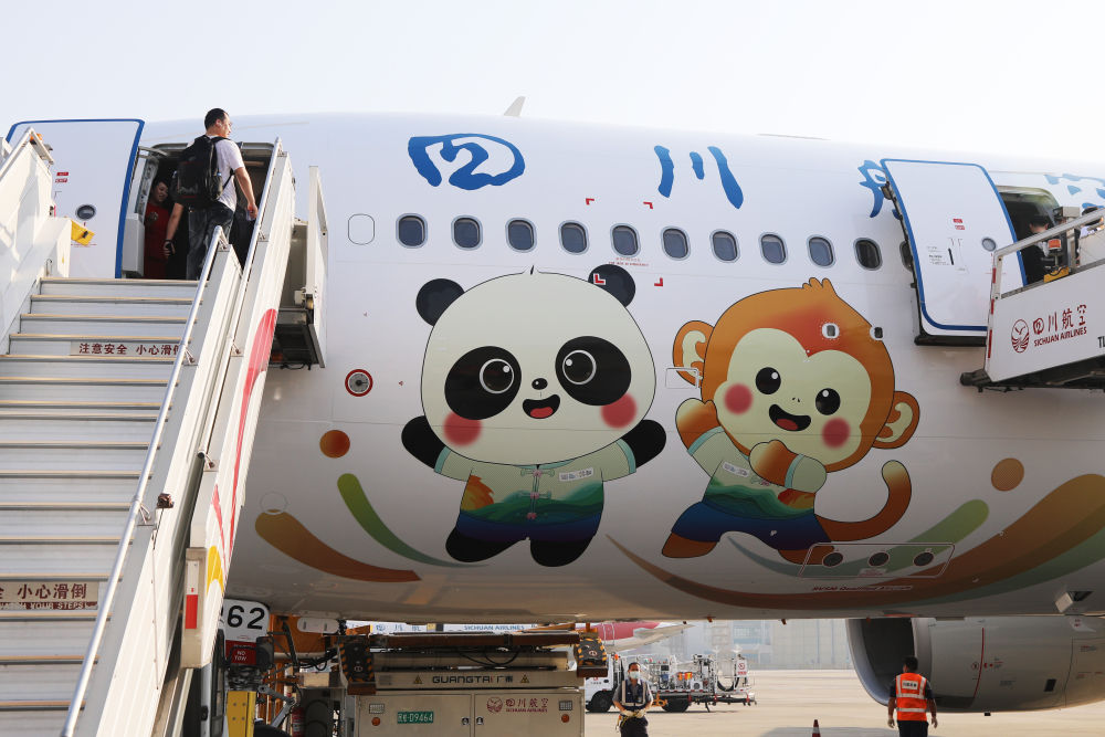 4月18日在成都雙流國(guó)際機(jī)場(chǎng)拍攝的首架“成都世運(yùn)號(hào)”主題涂裝飛機(jī)。新華社記者 楊進(jìn) 攝
