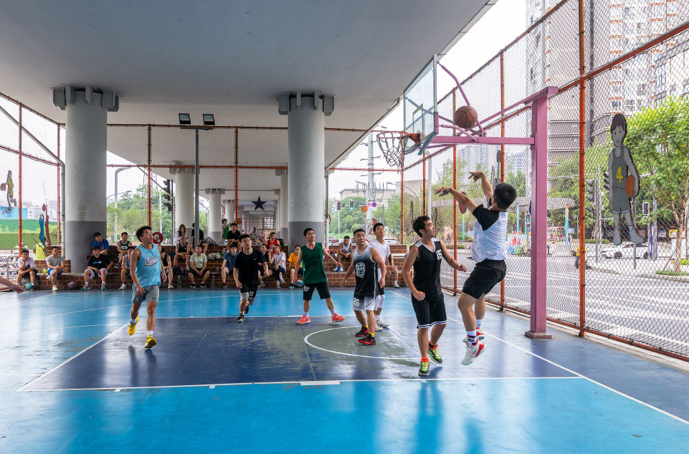 人們?cè)诔啥际懈嗦妨⒔粯蛳碌倪\(yùn)動(dòng)空間打籃球。(資料圖)新華社發(fā)(杜寧 攝)