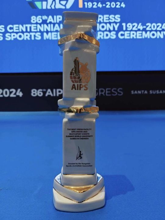 在2024年4月29日舉行的國(guó)際體育記者協(xié)會(huì)頒獎(jiǎng)典禮上,成都大運(yùn)會(huì)獲得2023年度綜合賽事最佳媒體設(shè)施服務(wù)獎(jiǎng)。新華社發(fā)