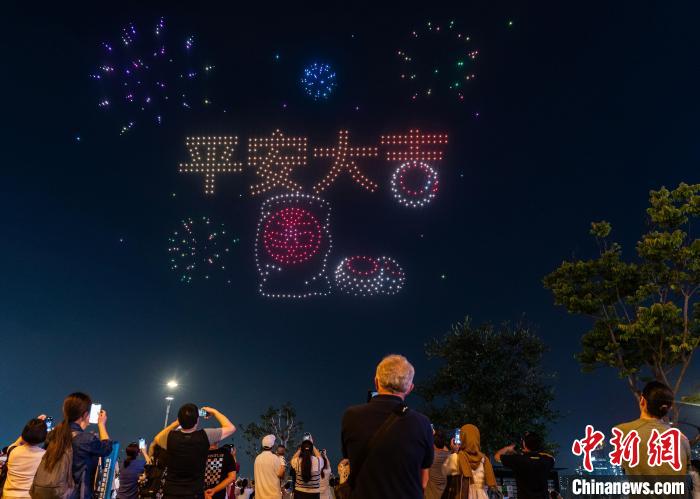 香港旅游發(fā)展局5月1日晚以天后誕、譚公誕及長(zhǎng)洲太平清醮三大傳統(tǒng)節(jié)慶為主題,在灣仔海濱舉辦無(wú)人機(jī)表演。香港特色民俗“搶包山”比賽場(chǎng)景在夜空出現(xiàn),“搶包山”搶上了天,引得圍觀(guān)人群贊嘆。