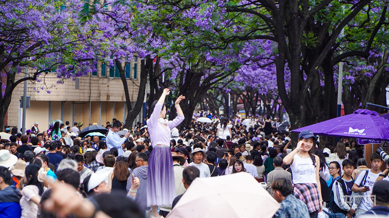 “五一”假期,前來昆明教場中路觀賞藍花楹的游客絡繹不絕(央廣網(wǎng)記者 魏文青 攝)