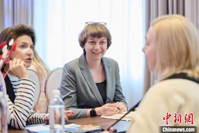 2025年3月,安娜斯塔西婭(左二)在莫斯科參加海南文旅推廣活動(dòng),與當(dāng)?shù)芈眯猩探涣鳌?受訪者 供圖)