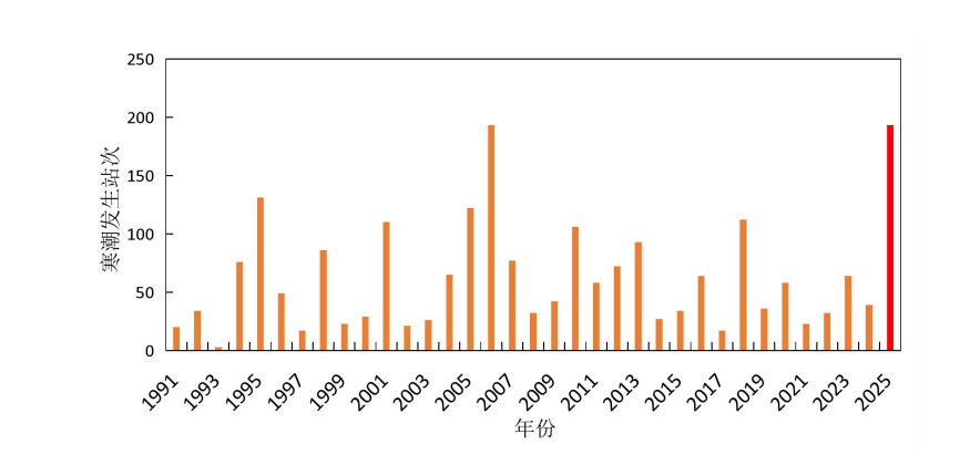 甘肅省氣象局統(tǒng)計(jì)的1991-2025年的3月1日至4月13日寒潮逐年變化柱狀圖。