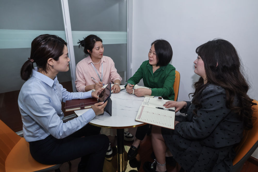 4月17日,在浙江星程吉月智能科技有限公司,富陽經(jīng)濟(jì)技術(shù)開發(fā)區(qū)助企服務(wù)專員(左二)、富陽農(nóng)商銀行工作人員(左一)上門解決企業(yè)融資需求。新華社記者 徐昱 攝