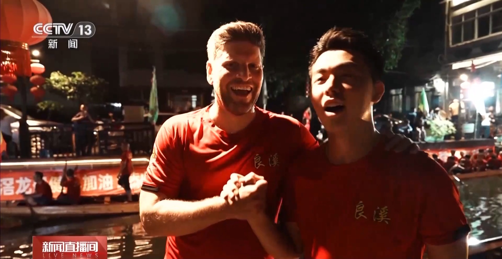 晚上8點(diǎn),當(dāng)記者來到佛山南海區(qū)的疊北社區(qū)時(shí),河道兩邊已經(jīng)圍滿了觀看夜訓(xùn)的村民和游客。伴隨著鏗鏘鼓點(diǎn)和陣陣歡呼,隊(duì)員們揮臂劃槳、破水前行,一艘艘龍舟在河道中穿梭、漂移、折返。在激烈的競技中,一個(gè)金發(fā)碧眼的外國面孔正和中國“扒仔”們一起奮力劃行。