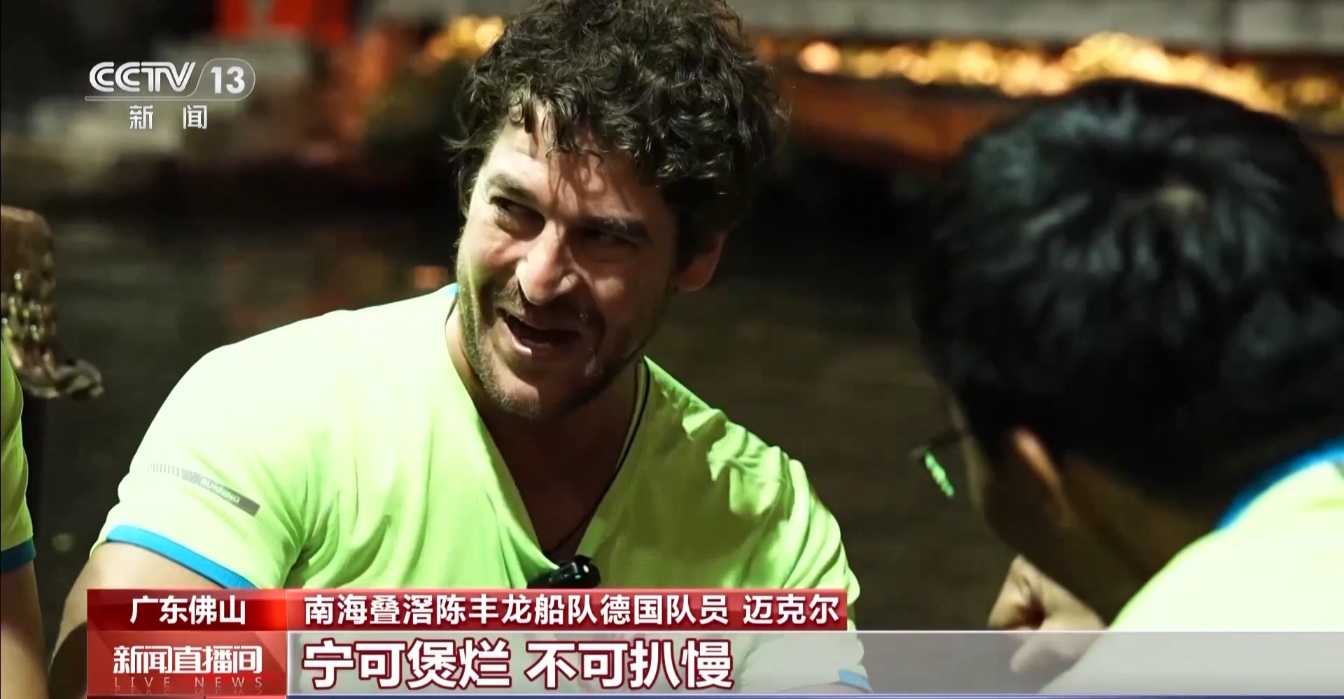 南海疊滘陳豐龍船隊(duì)德國隊(duì)員 邁克爾:隊(duì)員們從一開始就把我當(dāng)作他們中的一員,給了我很多幫助,讓我很快融入隊(duì)伍。有次我落水,身體甚至還沒有露出水面,已經(jīng)有兩只手把我抓回船上了。我覺得文化是沒有國界的,我們可以一起擁抱生活中美好的事物。