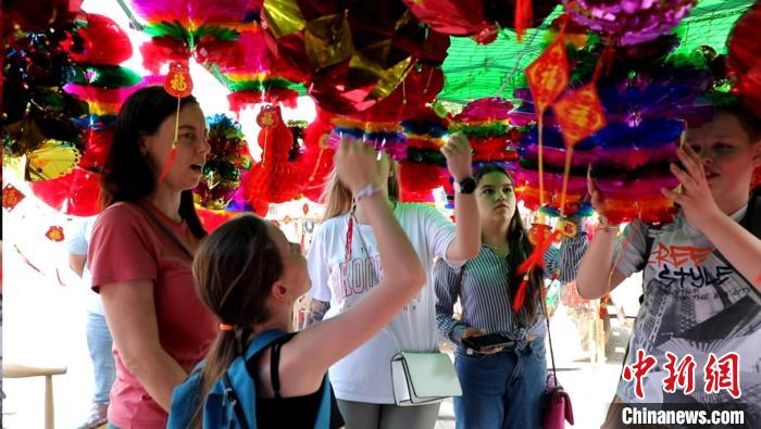 山腳下熱鬧的端午市集格外引人注目,琳瑯滿目的五彩繩、香包和手工飾品讓俄羅斯游客流連忘返,大家紛紛試戴購(gòu)買,感受著濃厚的節(jié)日氛圍。