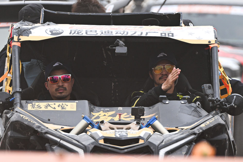 ↑6月1日,駕長(zhǎng)車(chē)隊(duì)車(chē)手吳京(右)、領(lǐng)航員梁冬冬在賽后參加收車(chē)儀式。新華社記者 辛悅衛(wèi) 攝