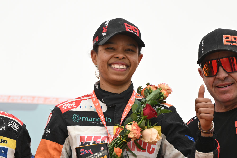 ↑6月1日,零公里潤(rùn)滑油ZM-Buggyra車(chē)隊(duì)塞舌爾車(chē)手阿莉亞·科洛克參加收車(chē)儀式。新華社記者 辛悅衛(wèi) 攝