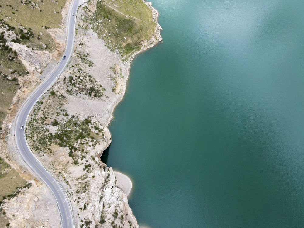 ↑這是2021年6月20日拍攝的車(chē)輛行駛在新疆獨(dú)庫(kù)公路上(無(wú)人機(jī)照片)