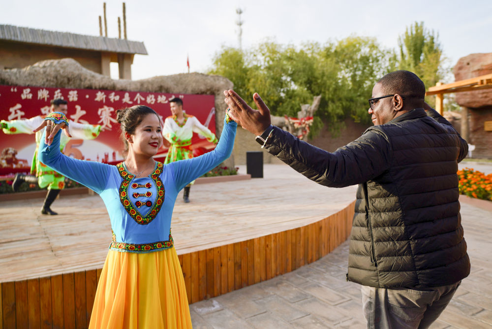 ↑2024年10月15日,第六屆世界媒體峰會(huì)與會(huì)嘉賓在阿克蘇地區(qū)新和縣加依村龜茲文化樂(lè)器展示中心與演員互動(dòng)。新華社記者 陳朔 攝