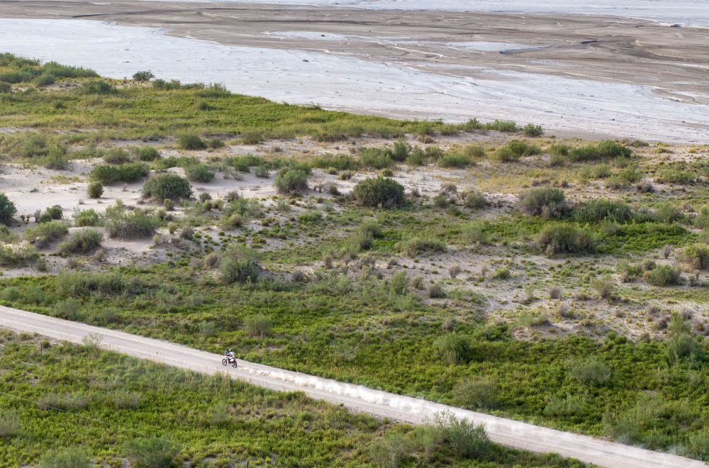 ↑5月26日,一輛摩托車(chē)行駛在第五賽段賽道上(無(wú)人機(jī)照片)