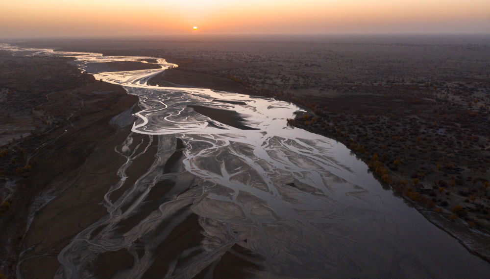 ↑這是在塔克拉瑪干沙漠腹地拍攝的新疆于田克里雅河國(guó)家濕地公園(2019年11月10日攝,無(wú)人機(jī)照片)。新華社記者 胡虎虎 攝