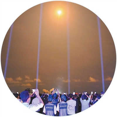 “5,4,3,2,1”——火箭的火焰照亮夜幕,平臺(tái)的光束射向天際……19時(shí)50分,火箭發(fā)射升空,游客們舉著手機(jī)記錄,現(xiàn)場(chǎng)歡呼聲陣陣?!昂芘d奮、很震撼,感覺(jué)一伸手就能‘抓’到火箭。”延鈺菲說(shuō)。