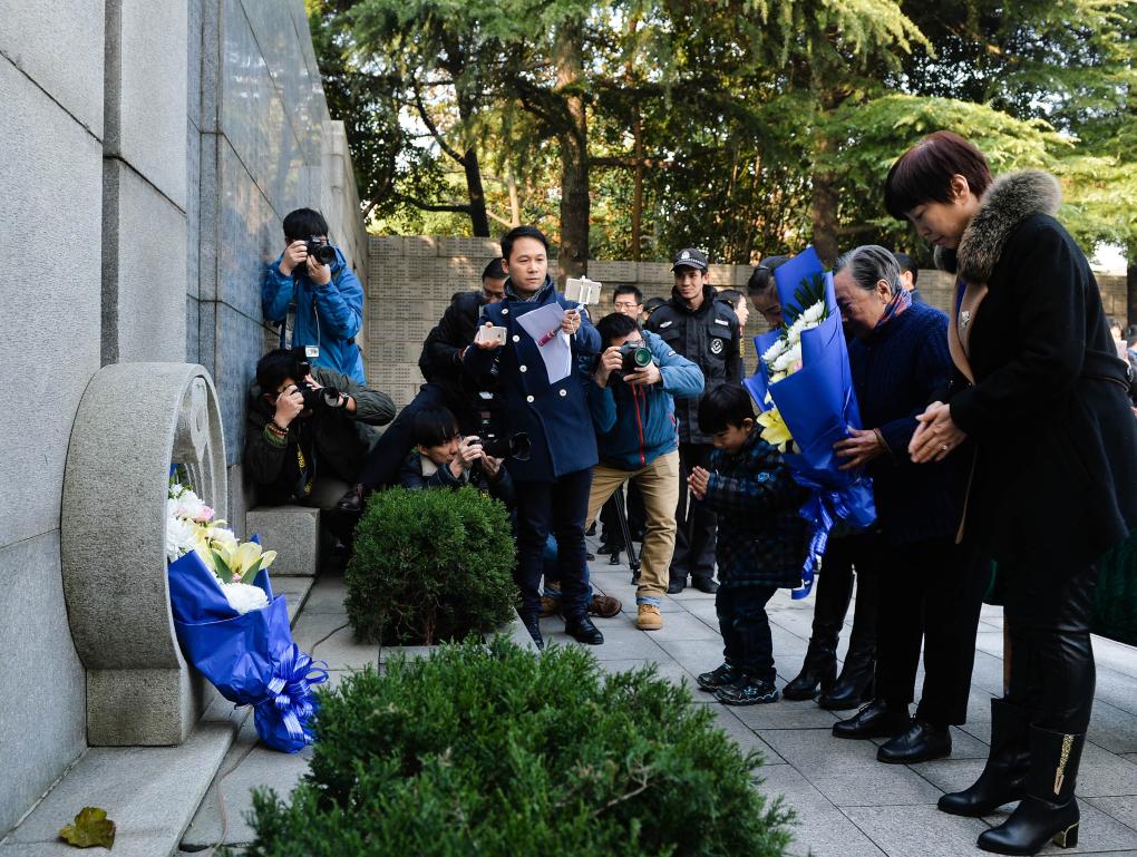 ↑2016年12月3日,夏淑琴(右二)和家人在侵華日軍南京大屠殺遇難同胞紀念館向遇難者獻花。