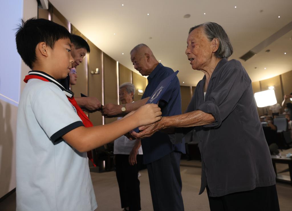 ↑2022年8月15日,在侵華日軍南京大屠殺遇難同胞紀念館,夏淑琴(右一)向曾外孫李玉瀚頒發(fā)“南京大屠殺歷史記憶傳承人”證書。新華社發(fā)