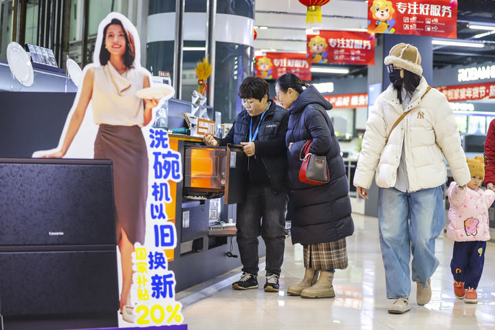 2025年1月8日,顧客在山東省青島市李滄區(qū)李村街道一家商場(chǎng)選購(gòu)洗碗機(jī)。新華社發(fā)(張鷹 攝)