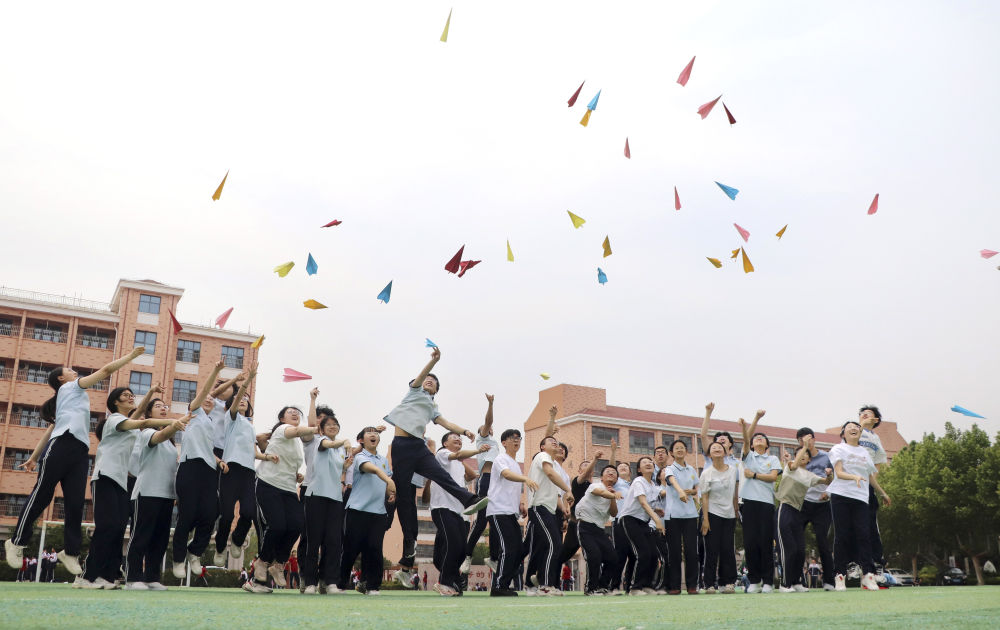 5月22日,在山東省高密市第五中學(xué),高三學(xué)生將寫有夢想的紙飛機拋向空中。