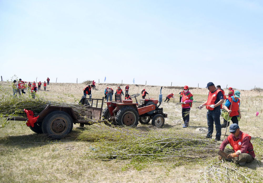 人們?cè)诘靥帨喩七_(dá)克沙地的正藍(lán)旗寶紹岱蘇木開(kāi)展植綠活動(dòng)。新華社 發(fā)