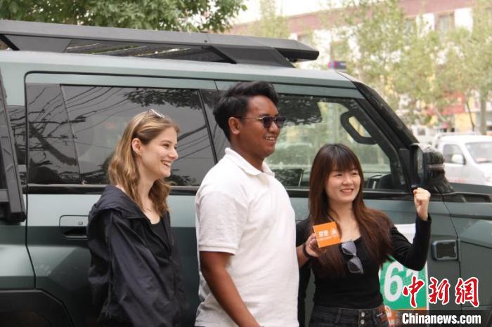 北京語言大學(xué)的留學(xué)生們在環(huán)塔拉力賽事期間體驗中國新能源車。賈志鵬 攝